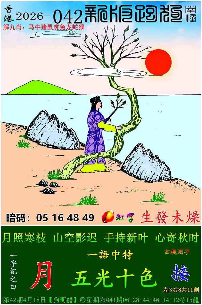 042期跑狗:【月】月照寒枝,山空影遲。手持新葉,心寄秋時。玄機測字:《接》