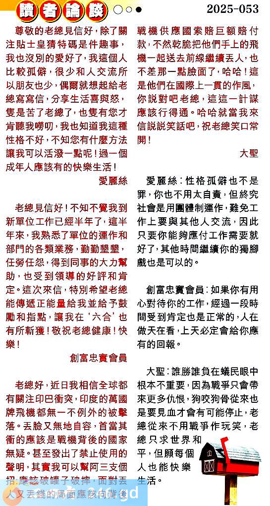 第零五三期讀者論談 1.尊敬的老總見信好,除了關注貼士皇猜特碼是件趣事,我也没別的愛好了,我這個人比較孤僻,很少和人交流所以朋友也少,偶爾就想起給老總寫寫信,分享生活喜與怒,隻是苦了老總了,也雙有您才肯聽我嘮叨,我也知道我這種性格不好,不知您有什麼方法讓我可以活潑一點呢!過一個成年人應該有的快樂生活!愛麗絲 〖愛麗絲〗:性格孤僻也不是罪,你也不用太自责,但終究.社會是用團體制運作,難免工作上要與其他人交流,因此只要你能夠應付工作需要就好了,其他時間繼續你的獨腳戲也是可以的。 2.老總見信好!不知不覺我到新單位工作已經半年了,這半年來,我熟悉了單位的運作和部門的各類業務,勤勤墾墾,任勞任怨,得到同事的大力幫助也受到領導的好評和肯定。這次來信,特別希望老總能傳遞正能量給我並給予鼓勵和指點,讓我在‘六合’也有所斬獲!敬祝老總健康!快樂!創富忠實會員 〖創富忠實會員〗:如果你有用心對待你的工作,經過一段時間受到肯定也是正常的,人在做天在看,上天必定會給你應有的回報。 3.老總好,近日我相信全球都有關注印巴衝突,印度的萬國牌飛機都無一不例外的被擊落。丟臉又無地自容,首當其衝的應該是戰機背後的國家無疑。甚至發出了禁止使用的聲明,其實我可以幫阿三支個招:應該破罐子破摔,面對丟人又丟錢的局面應該向背後戰機供應國索賠巨額賠付款,不然乾脆把他們手上的飛機一起送去前線繼續丟人,也不差那一點臉面了,哈哈!這是他們在國際上一贯的作風,你說對吧老總,這這一計謀應該行得通。哈哈就當我來信說說笑話吧,祝老總笑口常開!大聖 〖大聖〗:誰勝誰負在蟻民眼中根本不重要,因為戰爭只會帶來更多仇恨,狗咬狗骨從來也是要見血才會有可能停止,老總從來不用戰爭作玩笑,老總只求世界和平,但願每個人也能快樂生活。