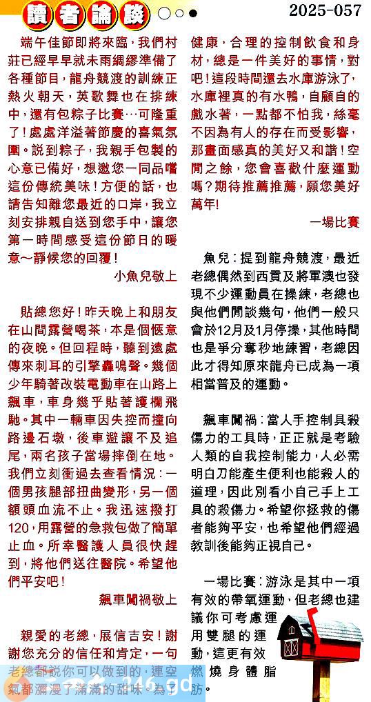 第零五七期讀者論談 1.端午佳節即將來臨,我們村莊已經早早就未雨綢繆準備了各種節目,龍舟競渡的訓練正熱火朝天,英歌舞也在排練中,還有包粽子比賽...可隆重了!處處洋溢著節慶的喜氣氛圍。說到粽子,我親手包製的心意已備好,想邀您一同品嚐這份傳統美味!方便的話,也請告知離您最近的口岸,我立刻安排親自送到您手中,讓您,第一時間感受這份節日的暖意靜候您的回覆!小魚兒敬上 〖魚兒〗:提到龍舟競渡,最近老總偶然到西貢及將軍澳也發現不少運動員在操練,老總也與他們闖談幾句,他們一般只會於12月及1月停操,其他時間也是爭分奪秒地練習,老總因此才得知原來龍舟已成為一項相當普及的運動。 2.貼總您好!昨天晚上和朋友在山間露營喝茶,本是個惬意的夜晚。但回程時,聽到遠處傳來刺耳的引擎轟鳴聲。幾個少年騎著改裝電動車在山路上飆車,車身幾乎貼著護欄飛馳。其中一輛車因失控而撞向路邊石墩,後車避讓不及追尾,兩名孩子當場摔倒在地我們立刻街過去查看情況:一個男孩腿部扭曲變形,另一個額頭血流不止。我迅速撥打120,用露營的急救包做了簡單止血。所幸醫護人員很快趕到,將他們送往醫院。希望他們平安吧!飆車闖禍敬上 〖飆車闖禍〗:當人手控制具殺傷力的工具時,正正就是考驗人類的自我控制能力,人必需明白刀能產生便利也能殺人的道理,因此別看小自己手上工具的殺傷力。希望你拯救的傷者能夠平安,也希望他們經過教訓後能夠正視自己。 3.親愛的老總,展信吉安!谢謝您充分的信任和肯定,一句老總都說你可以做到的,連空氣都澜漫了滿滿的甜味。為了健康,合理的控制飲食和身材,總是一件美好的事情,對吧!這段時間還去水庫游泳了,水庫裡真的有水鴨,自顧自的戲水著,一點都不怕我,絲毫不因為有人的存在而受影響,那畫面感真的美好又和諧!空閒之餘,您會喜歡什麼運動嗎?期待推薦推薦,願您美好萬年!一場比賽 〖一場比賽〗:游泳是其中一項有效的帶氧運動,但老總也建議你可考慮運用雙腿的運,動,這更有效燃燒身體脂肪。