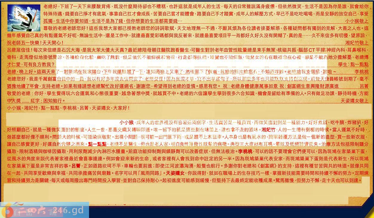 第057期《六合皇信箱文字版》10000%正確!!!正版二四六論壇*精心製作!!! 小小猴、湘妃竹、點一點點、李桃桃、呂菁、天姿嬌女,大家好! 【1】.老總好,下班了一天下來腰酸背疼,既沒什麼期待卻也不糟糕,也許這就是成年人的生活,每天的日常雖說滿身疲憊,但依然微笑,生活不是因為你是誰,就會給你特殊待遇,錢要自己掙才有底氣,事靠自己扛才會成長,苦要自己嘗才能體會,路要自己手才踏實,成年人的解壓方式,早已不是吃吃喝喝,而是安靜的放空自己,享受孤獨,生活中你要知道,生活不是為了錢,但你想要的生活都需要錢...小小猴敬上 〖小小猴〗:成年人的世界裡沒有容易這兩個字,生活實苦是一種真實,而微笑面對則是一種能力。好好煮飯、吃牛腩、炸猪扒,好好照顧自己,就是一種微笑面對的態度。人生一世,悲喜交織又轉瞬即逝。唯一留下的就是這些刻在味蕾上、誰也拿不走的滋味。 【2】.尊敬的老總老師您好!這些我想大家都已授教老師您的詩詞歌賦,天文地理無一不通,不厭其煩為各位讀者排憂解惑,各種疑問都有獨到的見解,大善之人也。這幾年感覺自己真的有點運氣不好呢,無論生活中,還是工作中,就連最喜爱彩碼都與我反著來,就連最喜愛項目平一肖都好久好久沒有開糊了,真的......久不來信多有叨擾,望原諒,祝老師五一快樂!天天開心!湘妃竹敬上 〖湘妃竹〗:人的一生總有倒楣的時候。當人運氣不好時,做甚麼都好像不順利。問題大的時候,可能染病破財。出現小問題,很可能一出門就下雨,或是趕不上末班車。人本身也是有風水的,簡單轉運方法是做一個新的造型,買一些新衣服,讓自己感覺更好,好運自然會隨之而來。 【3】.呂總展信佳!每次來信總是石沉大海,是我太笨太傻太天真?最近總陪母親往醫院跑看醫生,可醫生對於老年血管性眩暈總是束手無策,核磁共振腦部平掃;神經內科,耳鼻喉科,骨科,走馬燈似地掛號問診,各種檢查化驗,藥吃了無數,但是依舊不能仰視和俯視,行走都得扶牆,睡覺也不能仰臥,做兒女的看在眼裡急在心裡,卻是不能為她分擔解憂,老總博才仁爱,可有良方教我?學生:點一點點 〖點一點點〗:老總不是醫生,但也是老人家明白良性陣發性眩暈的病徵。典型三大症狀有耳鳴、暈眩及低頻聽覺喪失。治療方法包括限制鹽分攝取、限制酒精與咖啡因攝取、用利尿劑減少內淋巴水腫量。前庭功能抑制劑與鎮靜劑可以改善症狀,但無法根治。 【4】.老總,晚上好。這兩天來了一對斑鳩在我家陽台,下午我還驅趕了一下,誰知道晚上又來了,然後就下了個蛋,我拍的照片给您看,不知道咋辩。老總給我支個招,謝啦李桃桃 〖李桃桃〗:可以的話不要理會它們便可以,因為斑鳩在家築巢下蛋,從風水的角度來說代表著家裡最近會喜事連連。例如會迎來新的生命,或者家裡有人會找到命中注定的另一半。因為斑鳩築巢代表安家,而斑鳩築巢下蛋則是代表新生,所以斑鳩在家築巢下蛋是非常吉祥的事。 【5】.老總您好,我是千萬創富會員中的一員,我以有好多年沒去信問安了,老總莫怪!因為我沒才華,寫不出華麗句子,所以那麼多年也只能默默支持創富網。前幾天會員帳號到期了,毫不猶豫地續了年會,支持老總。如果有緣請想老總幫忙改好運網名,謝謝您,希望得到老總的垂憐。感恩有您。祝:老總身體健康萬事如意祝:創富網生意興隆財源廣進呂菁 〖呂菁〗:正如道路坎坷不平,車輪也要前進;即使江河波濤洶湧,船隻也航行。多謝你對老總和《創富網》的支持,這裡有種甘苦與共的味道。就像共同在一起、共同享受歡樂與幸福,共同承擔痛苦與磨難。名字可以用「風雨同路」。 【6】.敬愛的老總:你好,學生覺得玩六合運氣和心態很重要,越急著想中獎,就越買不中。老總的六信讓學生學到很多六合知識,機會是留給有準備的人。只有做足功課,靜待時機,方能中大獎......紅字:困知勉行。天姿嬌女敬上 〖天姿嬌女〗:你說得對,就如在職場上的生存技巧一樣,掌握新技能需要時間和持續不懈的努力。定期練習和持續努力是關鍵,每天或每周撥出專門時間投入學習,並對自己保持耐心。起初進度可能感到緩慢,但堅持下去最終定能收穫成果。駑馬雖慢,但努力不懈,走十天也可以到達。 紅字:百密一疏 暗码:10192228 [释义]指在极周密的考虑中偶然出现疏忽。 [出处]清·魏源《庸易通义》:“至道问学之有知无行,分温故为存心,知新为致知,而敦厚为存心,崇礼为致知,此皆百密一疏。”