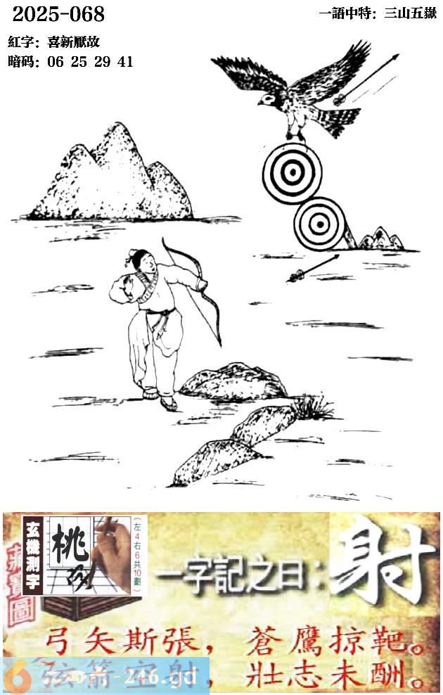068期跑狗一字記之曰:【射】 弓矢斯張,蒼鷹掠靶。 弦箭空射,壯誌未酬。 玄機測字:《桃》 一語中特:三山五嶽