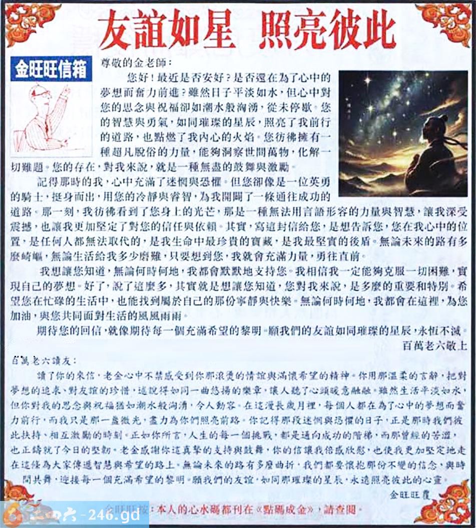 074期:金旺旺信箱彩民推荐→→《友誼如星 照亮彼此》