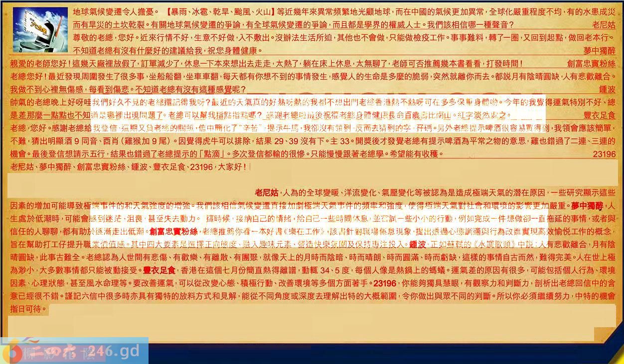 第076期《六合皇信箱文字版》10000%正確!!!正版二四六論壇*精心製作!!! 老尼姑、夢中獨醉、創富忠實粉絲、鍾波、豐衣足食、23196,大家好! 【1】.地球氣候變遷令人擔憂。【暴雨、冰雹、乾旱、颱風、火山】等近幾年來異常頻繁地光顧地球,而在中國的氣候更加異常,全球化嚴重程度不均,有的水患成災而有旱災的土坎乾裂。有關地球氣候變遷的爭論,有全球氣候變遷的爭論,而且都是學界的權威人士。我們該相信哪一種聲音?老尼姑 〖老尼姑〗:人為的全球變暖、洋流變化、氣壓變化等被認為是造成極端天氣的潛在原因,一些研究顯示這些因素的增加可能導致極端事件的和天氣強度的增強。我們該相信氣候變遷直接加劇極端天氣事件的頻率和強度,使得極端天氣對社會和環境的影響更加嚴重。 【2】.尊敬的老總,您好。近來行情不好,生意不好做,入不敷出。沒辦法生活所迫,其他也不會做,只能做檢疫工作。事事難料,轉了一圈,又回到起點,做回老本行。不知道老總有沒有什麼好的建議給我,祝您身體健康。夢中獨醉 〖夢中獨醉〗:人生處於低潮時,可能會感到迷茫、沮喪,甚至失去動力。這時候,接納自己的情緒,給自己一些時間休息,並嘗試一些小小的行動,例如完成一件想做卻一直拖延的事情,或者與信任的人聊聊,都有助於逐渐走出低潮。 【3】.親爱的老師您好!這幾天廠裡放假了,訂單減少了,休息一下本來想出去走走,太熱了,躺在床上休息太無聊了,老師可否推薦幾本書看看,打發時間!創富忠實粉絲 〖創富忠實粉絲〗:老總推薦你看一本好書《樂在工作》該書針對職場倦怠現象,提出透過心態調適與行為改進實現高效愉悦工作的概念,旨在幫助打工仔提升職業價值感。其中四大要素是選擇正向態度、融入趣味元素、營造快樂氛圍及保持專注投入。 【4】.老總您好!最近發現周圍發生了很多事,坐船船翻,坐車車翻,每天都有你想不到的事情發生,感覺人的生命是多麼的脆弱,突然就離你而去。都说月有陰晴圓缺,人有悲歡離合。我做不到心裡無傷感,每看到傷悲。不知道老總有沒有這種感覺呢?鍾波 〖鍾波〗:正如蘇軾的《水調歌頭》中說:人有悲歡離合,月有陰晴圓缺,此事古難全。老總認為人世間有悲傷、有歡樂、有離散、有團聚,就像天上的月時而陰暗、時而晴朗、時而圓滿、時而虧缺,這樣的事情自古而然,難得完美。人在世上極為渺小,大多數事情都只能被動接受。 【5】.帥氣的老總晚上好呀哇我們好久不見的老總還記得我呀?最近的天氣真的好熱呀熟的我都不想出門老總香港熱不熱呀可在多多保重身體喲。今年的我覺得運氣特別不好、總是差那麼一點點也不知道是哪裡出現問題了。老可以我指點指點嗎?感謝老總啦最後祝福老總身體健康長命百歲壽比南山。紅字谈然處之。豐衣足食 〖豐衣足食〗:香港在這個七月份簡直熱得離譜,動輒34.5度,每個人像是熱鍋上的螞蟻。運氣差的原因有很多,可能包括個人行為、環境因素、心理狀態,甚至風水命理等。要改善運氣,可以從改變心態、積極行動、改善環境等多個方面著手。 【6】.老總,您好感謝老總給我登信,這期又負老總的關照,信中商化了“辛苦”,提示牛馬,我卻沒有領到,反而去猜到的字孖碼。另外老總提示啤酒很容易買得到,我領會應該簡單,不難,猜出明顯酒9同音、酉肖(雞猴加9尾)。因覺得虎牛可以排除,結果29、39沒有下。主33。開獎後才發覺老總有提示啤酒為平常之物的意思,雞也錯過了二連、三連的機會。最後登信想請示五行,結果也錯過了老總提示的「點滴」。多次登信都輸的很惨。只能慢慢跟著老總學。希望能有收穫。23196 〖23196〗:你能夠獨具慧眼,有觀察力和判斷力,剖析出老總回信中的含意已經很不錯。謹記六信中很多時亦具有獨特的放料方式和見解,能從不同角度或深度去理解出特的大概範圍,令你做出與眾不同的判斷。所以你必須繼續努力,中特的機會指日可待。 紅字:柳影花陰 暗码:10152742 [释义]指男女幽会之处。引申为男女情爱之事。 [出处]元·王实甫《西厢记》第三本第四折:“心不存学海文林,梦不离柳影花阴,则去那窃玉偷香上用心。”