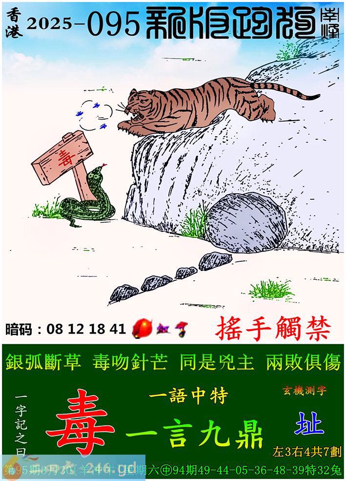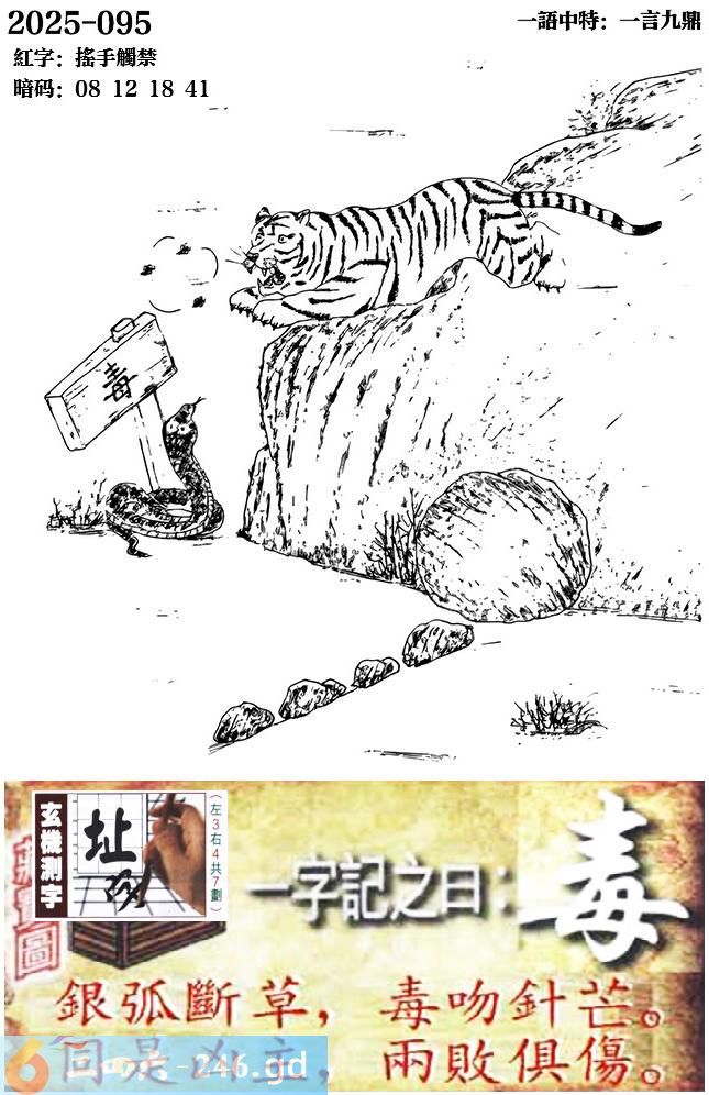 095期跑狗一字記之曰:【毒】 銀弧斷草,毒吻針芒。 同是兇主,兩敗俱傷。 玄機測字:《址》 一語中特:一言九鼎