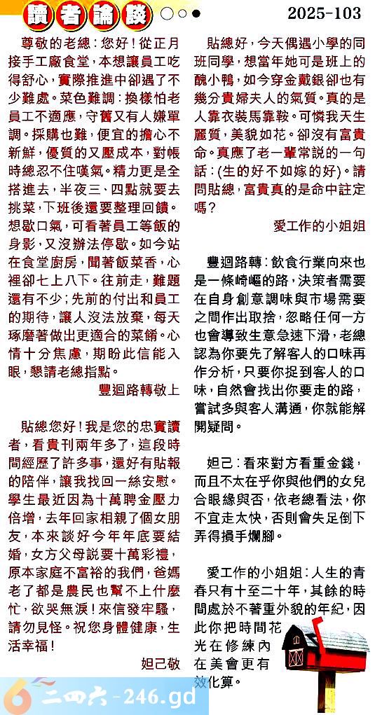 第一零二期讀者論談 1.尊敬的老總:您好!從正月接手工廠食堂,本想讓員工吃得舒心,實際推進中卻遇了不少難處。菜色難調:换樣怕老員工不適應,守舊又有人嫌單調。探購也難,便宜的擔心不新鮮,優質的又壓成本,對帳時總忍不住嘆氣。精力更是全搭進去半夜三、四點就要去挑菜,下班後還要整理回饋想歇口氣,可看著員工等飯的身影,又沒辦法停歇。如今站在食堂廚房,聞著飯菜香,心裡卻七上八下。往前走,難題還有不少;先前的付出和員工的期待,讓人沒法放棄,每天琢磨著做出更適合的菜饈。心情十分焦慮,期盼此信能入眼,懇請老總指點。豐迴路轉敬上 〖豐迴路轉〗:飲食行業向來也是一條崎嶇的路,決策者需要在自身創意調味與市場需要之間作出取捨,忽略任何一方也會導致生意急速下滑,老總認為你要先了解客人的口味再作分析,只要你捉到客人的口味,自然會找出你要走的路,嘗試多與客人溝通,你就能解開疑問。 2.貼總您好!我是您的忠實讀者,看貴刊兩年多了,這段時間經歷了許多事,還好有貼報的陪伴,讓我找回一絲安慰。學生最近因為十萬聘金壓力倍增,去年回家相親了個女朋友,本來談好今年年底要結婚,女方父母說要十萬彩禮,原本家庭不富裕的我們,爸媽老了都是農民也幫不上什麼忙,欲哭無淚!來信發牢騷,請勿見怪。祝您身體健康,生活幸福!妲己敬 〖妲己〗:看來對方看重金錢,而且不太在乎你與他們的女兒合眼緣與否,依老總看法,你不宜走太快,否則會失足倒下弄得損手爛腳。 3.貼總好,今天偶遇小學的同班同學,想當年她可是班上的醜小鴨,如今穿金戴銀卻也有幾分貴婦夫人的氣質。真的是人靠衣裝馬靠鞍。可憐我天生麗質,美貌如花。卻沒有富貴命。真應了老一輩常說的一句話:(生的好不如嫁的好)。請問貼總,富貴真的是命中註定嗎?愛工作的小姐姐 〖愛工作的小姐姐〗:人生的青春只有十至二十年,其餘的時間處於不著重外貌的年紀,因此你把時間花光在修練內在美會更有效化算。