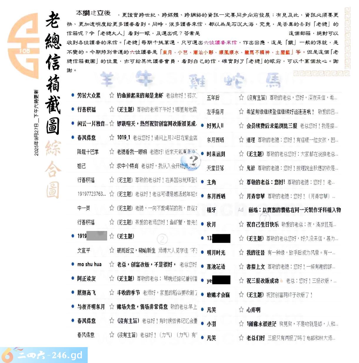 105期:六合皇金句/老总论码/萧公子/林大师/五行夺码/老总信箱截图