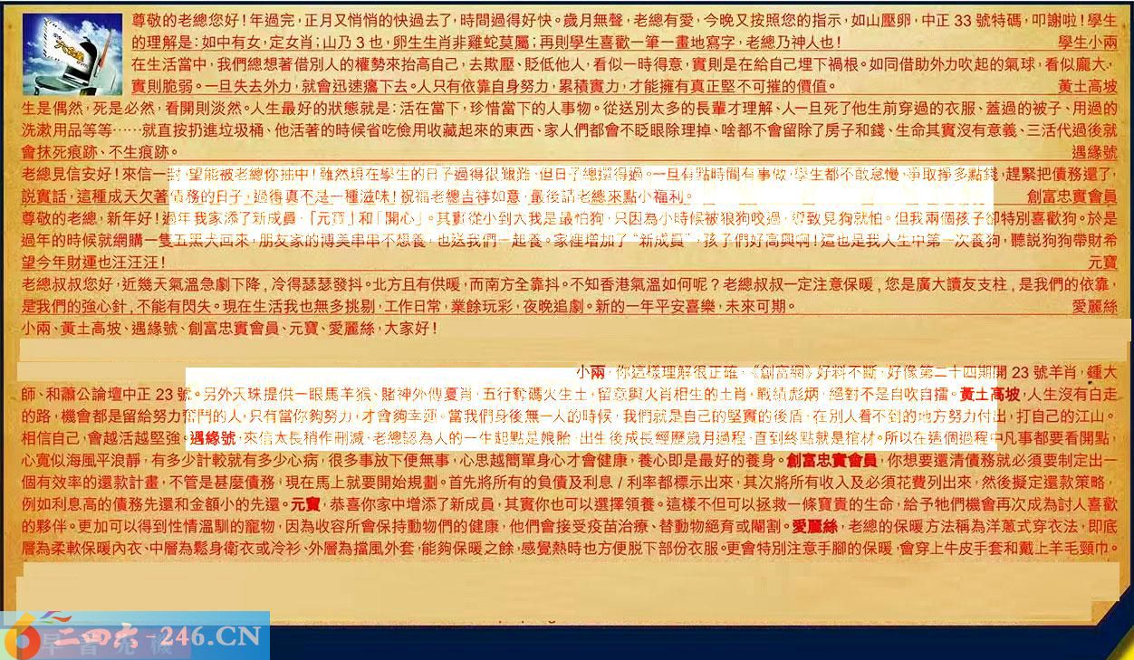 第030期《六合皇信箱文字版》10000%正確!!!正版二四六論壇*精心製作!!! 小兩、黄土高坡、遇緣號、創富忠實會員、元寶、愛麗絲,大家好! 【1】.尊敬的老總您好!年過完,正月又悄悄的快過去了,時間過得好快。歲月無聲,老總有愛,今晚又按照您的指示,如山壓卵,中正33號特碼,叩謝啦!學生的理解是:如中有女,定女肖山乃3也,卵生生肖非雞蛇莫屬;再則學生喜歡一筆一畫地寫字,老總乃神人也!學生小兩 〖小兩〗:你這樣理解很正確,《創富網》好料不断,好像第二十四期開23號羊肖,鍾大師、和蕭公論壇中正23號。另外天珠提供一眼馬羊猴、賭神外傳夏肖,五行套碼火生土,留意與火肖相生的土肖,戰績彪炳,絕對不是自吹自擂。 【2】.在生活當中,我們總想著借別人的權勢來抬高自己,去欺壓、貶低他人,看似一時得意,實則是在給自己埋下禍根。如同借助外力吹起的氣球,看似龐大,實則脆弱。一旦失去外力,就會迅速癟下去。人只有依靠自身努力,累積實力,才能擁有真正堅不可摧的價值。黃土高坡 〖黄土高坡〗:人生沒有白走的路,機會都是留給努力奮門的人,只有當你夠努力才會夠幸運。當我們身後無一人的時候,我們就是自己的堅實的後盾,在別人看不到的地方努力付出,打自己的江山。相信自己會越活越堅強。 【3】.生是偶然,死是必然,看開則淡然。人生最好的狀態就是:活在當下,珍惜當下的人事物。從送別太多的長輩才理解、人一旦死了他生前穿過的衣服、蓋過的被子、用過的洗漱用品等等......就直按扔進垃圾桶、他活著的時候省吃儉用收藏起來的東西、家人們都會不眨眼除理掉、啥都不會留除了房子和錢、生命其實沒有意義、三活代過後就會抹死痕跡、不生痕跡。遇緣號 〖遇緣號〗:來信太長稍作刪減,老總認為人的一生起點是娘胎,出生後成長經歷歲月過程直到終點就是棺材。所以在這個過程中凡事都要看開點,心寬似海風平浪靜,有多少計較就有多少心病,很多事放下便無事,心思越簡單身心才會健康,養心即是最好的養身。 【4】.老總見信安好!來信一封,望能被老總你抽中!雖然現在學生的日子過得很艱難,但日子總還得過。一旦有點時間有事做,學生都不敢怠慢,爭取掙多點錢,趕緊把債務還了,說實話,這種成天欠著債務的目子,過得真不是一种滋制!祝福老吉祥如意,最後請老總來點小福利。創富忠實會員 〖創富忠實會員〗:你想要還清債務就必須要制定出一個有效率的還款計畫,不管是甚麼債務,現在馬上就要開始規劃。首先將所有的負債及利息/利率都標示出來,其次將所有收入及必須花費列出來,然後擬定還款策略,例如利息高的債務先還和金額小的先還。 【5】.尊敬的老總,新年好!過年我家添了新成員,元寶和「開心」。其實從小到大我是最怕狗,只因為小時候被狼狗咬過,遵致見狗就怕。但我兩個孩子卻特別喜歡狗。於是過年的時候就網購一隻五黑犬回來,朋友家的博美串串不想養,也送我們一起養。家裡增加了新成員”,孩子們好高興啊!這也是我人生中第一次養狗,聽說狗狗帶財希望今年財運也汪汪汪!元寶 〖元寶〗:恭喜你家中增添了新成員,其實你也可以選擇領養。這樣不但可以拯救一條寶貴的生命,給予他們機會再次成為討人喜歡的夥伴。更加可以得到性情溫馴的寵物,因為收容所會保持動物們的健康,他們會接受疫苗治療、替動物絕育或閹割。 【6】.老總叔叔您好,近幾天氣溫急劇下降,冷得瑟瑟發抖。北方且有供暖,而南方全靠抖。不知香港氣溫如何呢?老總叔叔一定注意保暖,您是廣大讀友支柱,是我們的依靠,是我們的強心針,不能有閃失。現在生活我也無多挑剔,工作日常,業餘玩彩,夜晚追劇。新的一年平安喜樂,未來可期。愛麗絲 〖愛麗絲〗:老總的保暖方法稱為洋蔥式穿衣法,即底層為柔軟保暖內衣、中層為鬆身衛衣或冷衫、外層為擋風外套,能夠保暖之餘,感覺熱時也方便脱下部份衣服。更會特別注意手腳的保暖,會穿上牛皮手套和戴上羊毛頸巾。 紅字:早著先機 暗码:08112136 [释义]指尽早抓住有利的时机。