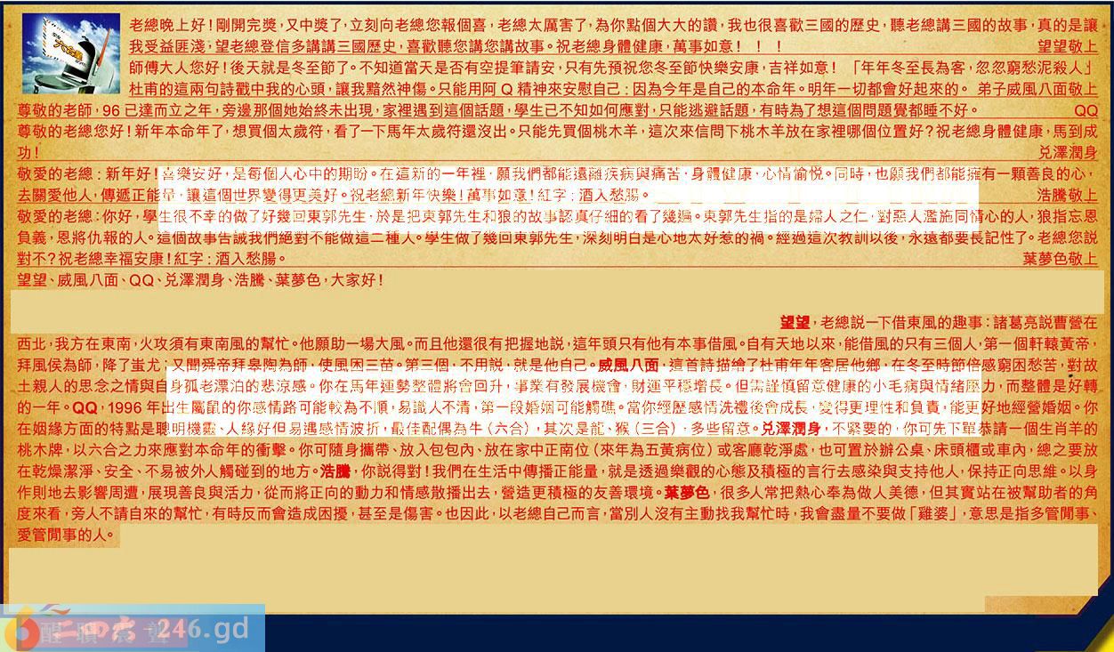 第006期《六合皇信箱文字版》10000%正確!!!正版二四六論壇*精心製作!!! 望望、威風八面、、兑澤潤身、浩騰、葉夢色,大家好! 【1】.老總晚上好!剛開完獎,又中獎了,立刻向老總您報個喜,老總太厲害了,為你點個大大的讃,我也很喜歡三國的歷史,聽老總講三國的故事,真的是讓我受益匪淺,望老總登信多講講三國歷史,喜歡聽您講您講故事。祝老總身體健康,萬事如意!!!望望敬上 〖望望〗:老總説一下借東風的趣事:諸葛亮説曹營在西北,我方在東南,火攻須有東南風的幫忙。他願助一場大風。而且他還很有把握地説,這年頭只有他有本事借風。自有天地以來,能借風的只有三個人,第一個軒轅黄帝,拜風侯為師,降了蚩尤;又聞舜帝拜皋陶為師,使風困三苗。第三個,不用説,就是他自己。 【2】.師傅大人您好!後天就是冬至節了。不知道當天是否有空提筆請安,只有先預祝您冬至節快樂安康,吉祥如意!「年年冬至長為客,忽忽窮愁泥殺人」杜甫的這兩句詩戳中我的心頭,讓我黯然神傷。只能用阿精神來安慰自己:因為今年是自己的本命年。明年一切都會好起來的。弟子威風八面敬上 〖威風八面〗:這首詩描繪了杜甫年年客居他鄉,在冬至時節倍感窮困愁苦,對故土親人的思念之情與自身孤老漂泊的悲涼感。你在馬年運勢整體將會回升,事業有發展機會,財運平穩增長。但需謹慎留意健康的小毛病與情緒壓力,而整體是好轉的一年。 【3】.尊敬的老師,96已達而立之年,旁邊那個她始終未出現,家裡遇到這個話題,學生已不知如何應對,只能逃避話題,有時為了想這個問題覺都睡不好。 〖〗:1996年出生屬鼠的你感情路可能較為不順,易識人不清,第一段婚姻可能觸礁。當你經歷感情洗禮後會成長,變得更理性和負責,能更好地經營婚姻。你在姻緣方面的特點是聰明機靈、人縁好但易遇感情波折,最佳配偶為牛(六合),其次是龍、猴(三合),多些留意。 【4】.尊敬的老總您好!新年本命年了,想買個太歲符,看了一下馬年太歲符還沒出。只能先買個桃木羊,這次來信問下桃木羊放在家裡哪個位置好?祝老總身體健康,馬到成功!兑澤潤身 〖兑澤潤身〗:不紧要的,你可先下單恭請一個生肖羊的桃木牌,以六合之力來應對本命年的衝撃。你可隨身攜帶、放入包包內、放在家中正南位(來年為五黄病位)或客廳乾淨處,也可置於辦公桌、床頭櫃或車內,總之要放在乾燥潔淨、安全、不易被外人觸碰到的地方。 【5】.敬愛的老總:新年好!喜樂安好是每個人心中的期盼。在這新的一年裡,願我們都能遠離疾病與痛苦,身體健康,心情偷悦。同時,也願我們都能擁有一顆善良的心,去關愛他人,傳遞正能量,讓這個世界變得更美好。祝老總新年快樂!萬事如意!紅字:酒入愁腸。浩腾敬上 〖浩騰〗:你説得對!我們在生活中傳播正能量,就是透過樂觀的心態及積極的言行去感染與支持他人,保持正向思維。以身作則地去影響周遭,展現善良與活力,從而將正向的動力和情感散播出去,營造更積極的友善環境。 【6】.敬愛的老總:你好,學生很不幸的做了好幾回東郭先生,於是把東郭先生和狼的故事認真仔細的看了幾遍。東郭先生指的是婦人之仁,對惡人濫施同情心的人,狼指忘恩負義,恩將仇報的人。這個故事告誡我們絕對不能做這二種人。學生做了幾回東郭先生,深刻明白是心地太好惹的禍。經過這次教訓以後,永遠都要長記性了。老總您説對不?祝老總幸福安康!紅字:酒入愁腸。葉夢色敬上 〖葉夢色〗:很多人常把熱心奉為做人美德,但其實站在被幫助者的角度來看,旁人不請自來的幫忙,有時反而會造成困擾,甚至是傷害。也因此,以老總自己而言,當別人沒有主動找我幫忙時,我會盡量不要做「雞婆」,意思是指多管聞事、愛管聞事的人。 紅字:醒聵震聾 暗码:12263145 [释义]犹言振聋发聩。使昏昧糊涂、不明事理的人为之震惊,受到启发。 [出处]陶曾佑《论小说之势力及其影响》:“一跃而登此庄严美丽之舞台中,一奋萃此醒聩震聋之盘涡里。”