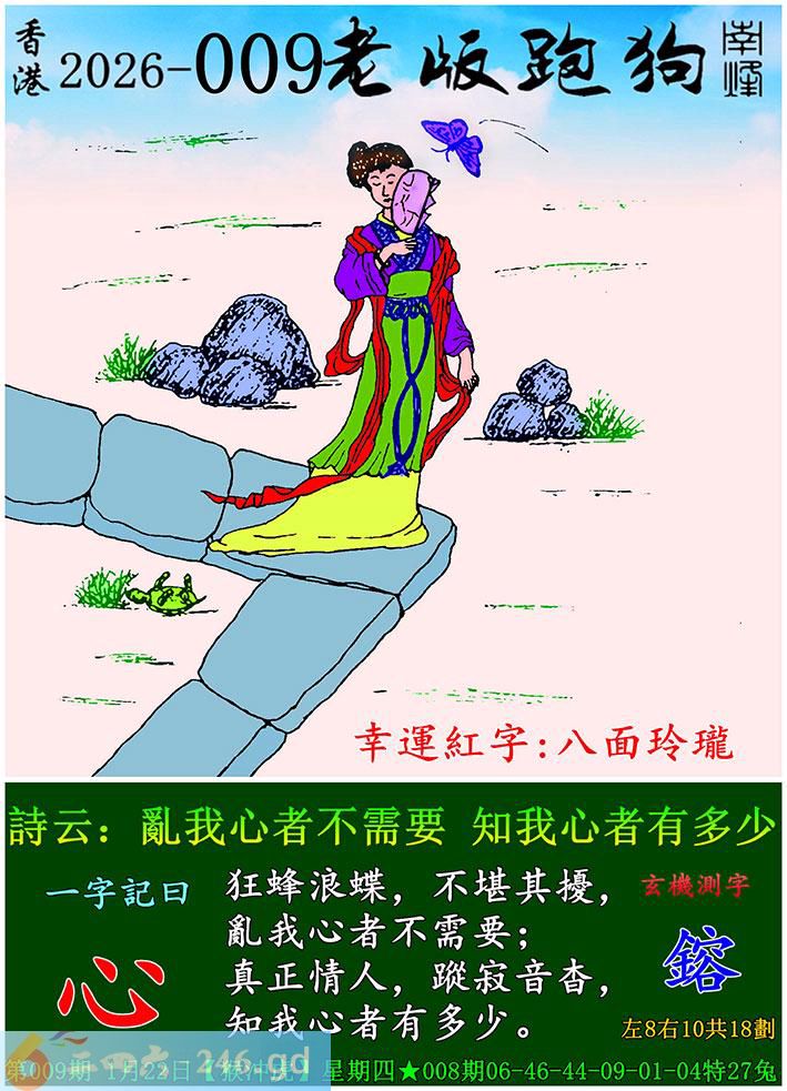 009期老版跑狗一字記之曰:【心】 詩雲:亂我心者不需要,知我心者有多少。 狂蜂浪蝶,不堪其擾,亂我心者不需要; 真正情人,蹤寂音杳,知我心者有多少。 玄機測字:《鎔》