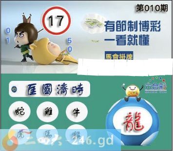 010期正版彩图挂:17爆:龙挂牌成语:匡国济时挂牌出肖:蛇鸡牛虎马猴正版数码挂牌:47射:2439壹句真言:故山岁晚谁堪寄(23568)四柱《四十不惑看得清》开奖时间:01月24日(星期六.狗冲龙)21:30分搅珠!