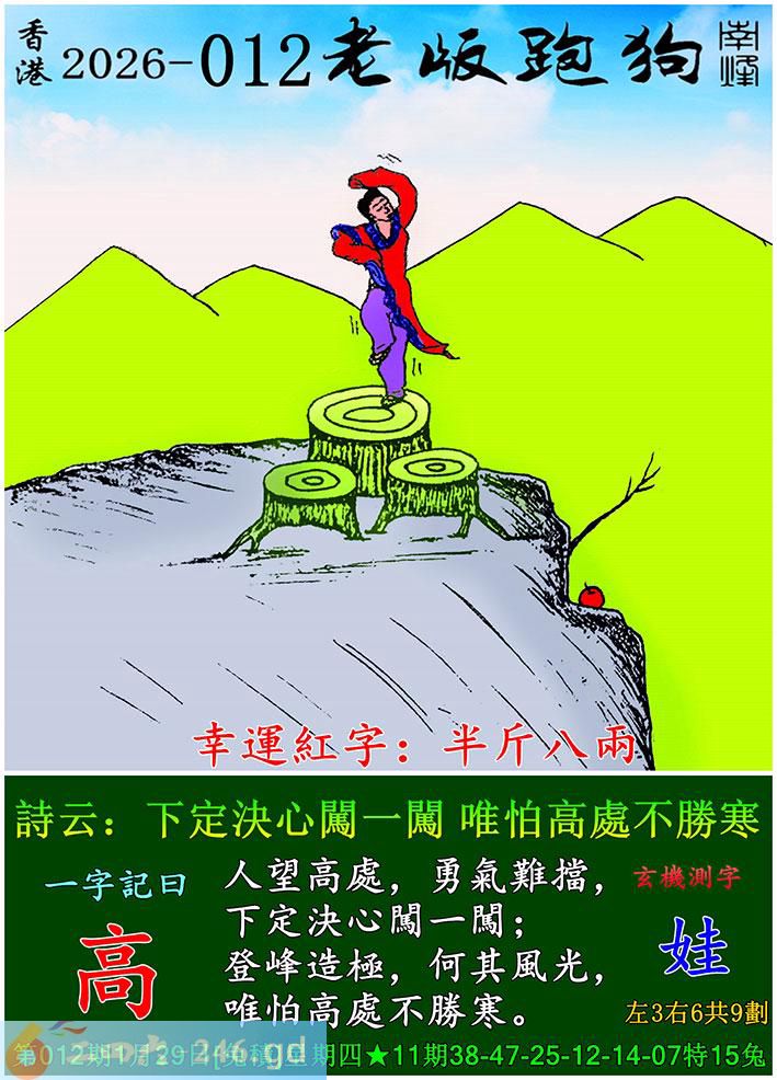 012期老版跑狗一字記之曰:【高】 詩雲:下定決心闖一闖,唯怕高處不勝寒。