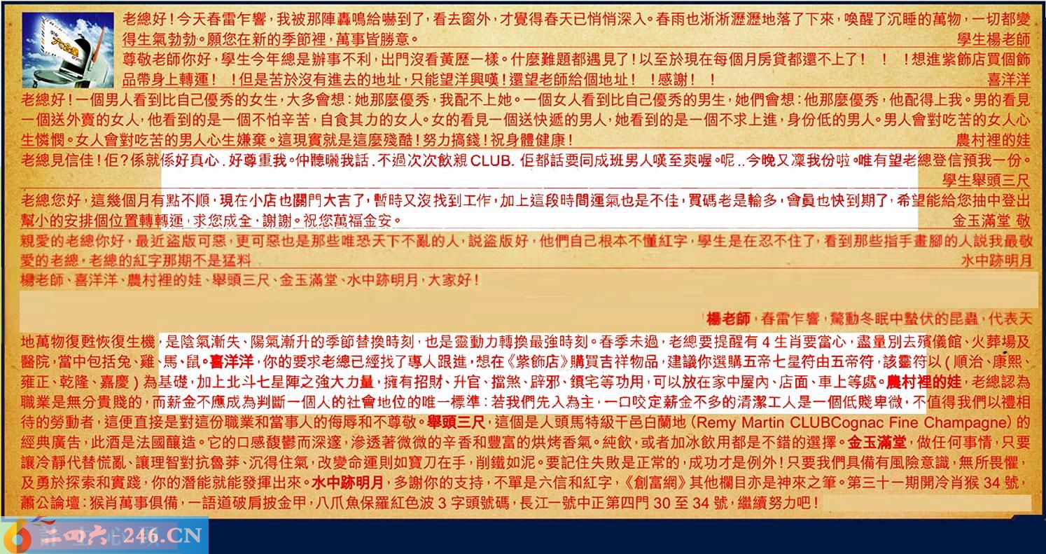第036期《六合皇信箱文字版》10000%正確!!!正版二四六論壇*精心製作!!! 楊老師、喜洋洋、農村裡的娃、舉頭三尺、金玉滿堂、水中跡明月,大家好! 【1】.老總好!今天春雷乍響,我被那陣轟鳴給嚇到了,看去窗外才覺得春天已悄悄深入。春雨也淅淅瀝瀝地落了下來,喚醒了沉睡的萬物,一切都變得生氣勃勃。願您在新的季節裡,萬事皆勝意。學生楊老師 〖楊老師〗:春雷乍響,騖動冬眠中蟄伏的昆蟲,代表天地萬物復甦恢復生機,是陰氣漸失、陽氣漸升的季節替換時刻,也是靈動力轉換最強時刻。春季未過,老總要提醒有4生肖要當心,盡量別去殯儀館、火葬場及醫院,當中包括兔、雞、馬鼠。 【2】.尊敬老師你好,學生今年總是辦事不利,出門沒看黃歷一樣。什麼難題都遇見了!以至於現在每個月房貸都還不上了!!!想進紫飾店買個飾品帶身上轉運!!但是苦於沒有進去的地址,只能望洋興嘆!還望老師給個地址!!感謝!!喜洋洋 〖喜洋洋〗:你的要求老總已經找了專人跟進,想在《紫飾店〉購買告祥物品,建議你選購五帝七星符由五帝符,該符以(順治、康熙、雍正、乾隆、嘉慶)為基礎,加上北斗七星陣之強大力量,擁有招財、升官、擋煞、辟邪、鎮宅等功用,可以放在家中屋內、店面、車上等處。 【3】.老總好!一個男人看到比自己優秀的女生,大多會想:她那麼優秀,我配不上她。一個女人看到比自己優秀的男生,她們會想:他那麼優秀,他配得上我。男的看見一個送外賣的女人,他看到的是一個不怕辛苦,自食其力的女人。女的看見一個送快遞的男人,她看到的是一個不求上進,身份低的男人。男人會對吃苦的女人心生憐憫。女人會對吃苦的男人心生嫌棄。這現實就是這麼殘酷!努力搞錢!祝身體健康!農村裡的娃 〖農村裡的娃〗:老總認為職業是無分貴賤的,而薪金不應成為判斷一個人的社會地位的唯一標準:若我們先入為主,一口咬定薪金不多的清潔工人是一個低賤卑微,不值得我們以禮相待的勞動者,這便直接是對這份職業和當事人的侮辱和不尊敬。 【4】.老總見信佳!但?係就係好真心,好尊重我。仲聽曬我話,不過次次飲親,但都話要同成班男人嘆至爽喔。呢..晚又凛我份啦。唯有望老總登信預我一份。學生舉頭三尺 〖舉頭三尺〗:這個是人頭馬特級干邑白蘭地()的經典廣告,此酒是法國釀造。它的口感馥鬱而深邃,滲透著微微的辛香和豐富的烘烤香氣。純飲,或者加冰飲用都是不錯的選擇。 【5】.老總您好,這幾個月有點不順,現在小店也關門大吉了,暫時又没找到工作,加上這段時間運氣也是不佳,買碼老是輸多會員也快到期了,希望能給您抽中登出幫小的安排個位置轉轉運求您成全,謝謝。祝您萬福金安。金玉滿堂敬 〖金玉滿堂〗:做任何事情,只要讓冷靜代替慌亂、讓理智對抗魯莽、沉得住氣,改變命運則如寶刀在手,削鐵如泥。要記住失敗是正常的,成功才是例外!只要我們具備有風險意識,無所畏懼,及勇於探索和實踐,你的潛能就能發揮出來。 【6】.親愛的老總你好,最近盗版可惡更可惡,也是那些唯恐天下不亂的人,說盜版好,他們自己根本不懂紅字,學生是在忍不住了,看到那些指手畫腳的人說我最敬愛的老總,老總的紅字那期不是猛料水中跡明月 〖水中跡明月〗:多謝你的支持,不單是六信和紅字,《創富網》其他欄目亦是神來之筆。第三十一期開冷肖猴34號,蕭公論壇:猴肖萬事俱備,一語道破盾披金甲,八爪魚保羅紅色波3字頭號碼,長江一號中正第四門30至34號,繼續努力吧! 紅字:計上心頭 暗码:10263642 [释义]指心里突然有了计策。 [出处]元·张氏《青衲袄·偷期》:“计上心头,暗令家童私问候。”