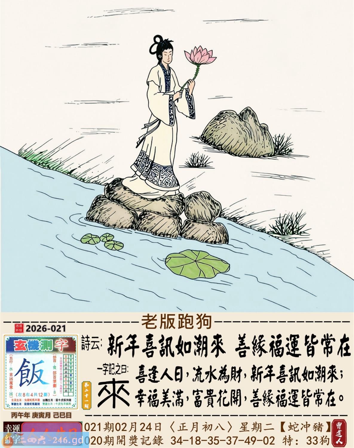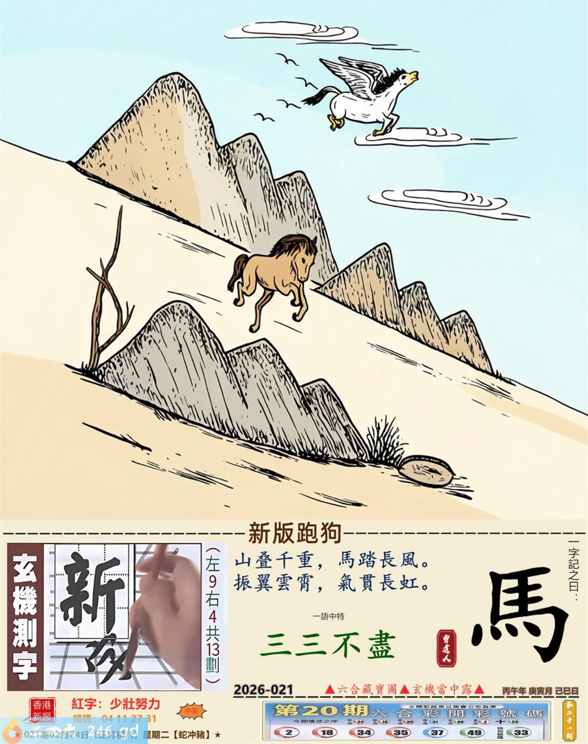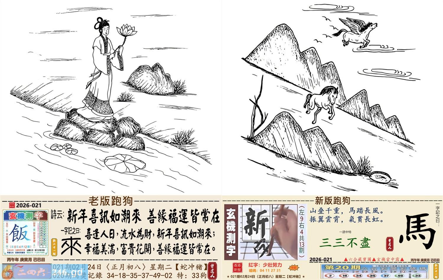 2026年2月24日021期侯(庚申(炉中火) 021期:老版跑狗玄機一字記之曰:【來】 詩云:新年喜訊如潮來善緣福運佳皆常在 喜逢人日,流水為財,新年喜訊如潮來; 幸福美滿,富貴花開,善緣福運佳皆常在。 玄機測字:《飯》 密圖詩:一方熱來一方冷 《記》:落入平川斷其尾 特碼大小單雙句:今期看單來發財 今期必中:曹操 021期:特碼歇后語 快刀砍水-----难分开 021期正版四字梅花诗:虎斗龙争。 021期火车头:烧伤马。诗:猪死猴伤,一九三肖对一双。 021期香港第一手欲钱料:顶天。 021期曾道人说:“马?” 021期另版四字梅花诗:鸡年贺喜。 021期香港第一手欲钱料:欲钱找灵小的动物。 021期曾道人说:“为什么有钱的人喜欢争夺名利”? 021期:二字經:一二 021期:穷鬼子是特码 021期:智力金壤;再接再厉 021期:信箱紅字:【少壯努力】 021期:【暗碼:04-11-27-31】 021期:一語中特:【三三不盡】 發財玄機圖:一日千里風馳電掣圖中明馬紅藍 021期:藏寳圖 新:飞流便向砌边挂 老:锦袖歌残翠黛尘 禁:兔禁:0尾玄機字《颉》 2026年021期【生活幽默】版 〖吃個蘋果吧〗 在一個漆黑的深夜裹,老王駕車回家開到半路,衹見一個女人要打車,要音异常凄惨:打車,打車。 老王讓她上了車。一路上兩人誰也没有説話,快到站時,那女人開口了:吃個蘋果吧!接遍蘋果,老王说:"谢谢"! 這時女人又説話了:"好吃嗎"?"好吃"。老王答應道。 那女的又接着説:"我生前最喜歡吃這種蘋果了。" 老王一聽,顿時嚇得尿了裤子,誰知那女的接着又:"不過我生完孩子就不喜歡吃了。"