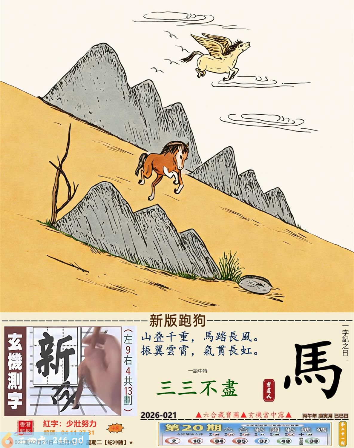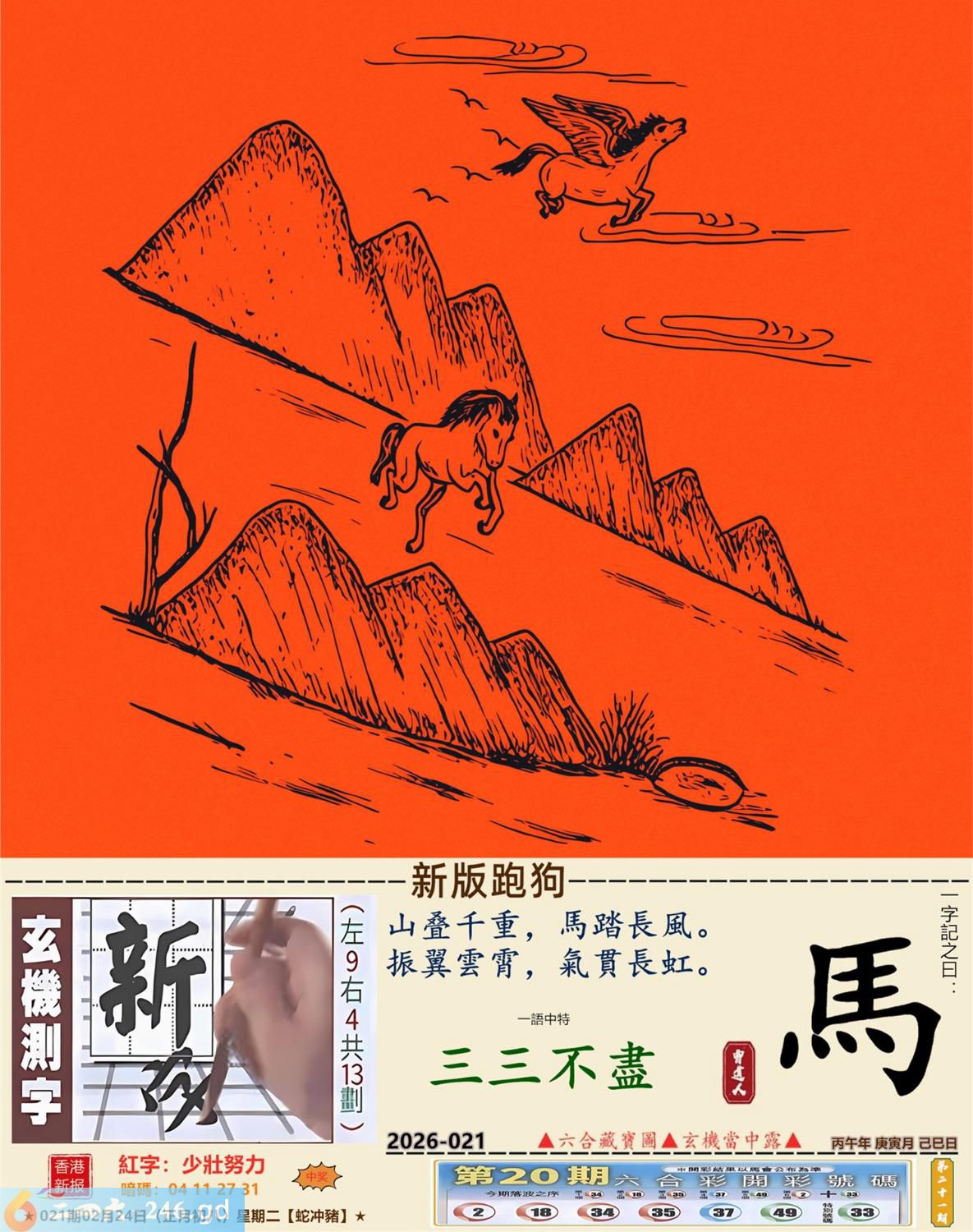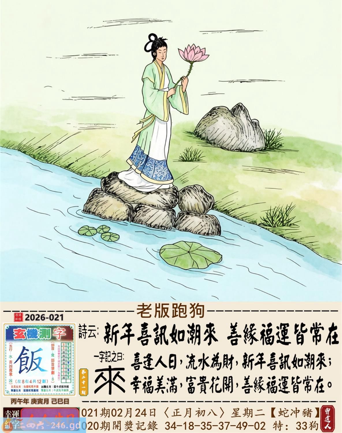 2026年2月24日021期侯(庚申(炉中火) 021期:老版跑狗玄機一字記之曰:【來】 詩云:新年喜訊如潮來善緣福運佳皆常在 喜逢人日,流水為財,新年喜訊如潮來; 幸福美滿,富貴花開,善緣福運佳皆常在。 玄機測字:《飯》 密圖詩:一方熱來一方冷 《記》:落入平川斷其尾 特碼大小單雙句:今期看單來發財 今期必中:曹操 021期:特碼歇后語 快刀砍水-----难分开 021期正版四字梅花诗:虎斗龙争。 021期火车头:烧伤马。诗:猪死猴伤,一九三肖对一双。 021期香港第一手欲钱料:顶天。 021期曾道人说:“马?” 021期另版四字梅花诗:鸡年贺喜。 021期香港第一手欲钱料:欲钱找灵小的动物。 021期曾道人说:“为什么有钱的人喜欢争夺名利”? 021期:二字經:一二 021期:穷鬼子是特码 021期:智力金壤;再接再厉 021期:信箱紅字:【少壯努力】 021期:【暗碼:04-11-27-31】 021期:一語中特:【三三不盡】 發財玄機圖:一日千里風馳電掣圖中明馬紅藍 021期:藏寳圖 新:飞流便向砌边挂 老:锦袖歌残翠黛尘 禁:兔禁:0尾玄機字《颉》 2026年021期【生活幽默】版 〖吃個蘋果吧〗 在一個漆黑的深夜裹,老王駕車回家開到半路,衹見一個女人要打車,要音异常凄惨:打車,打車。 老王讓她上了車。一路上兩人誰也没有説話,快到站時,那女人開口了:吃個蘋果吧!接遍蘋果,老王说:"谢谢"! 這時女人又説話了:"好吃嗎"?"好吃"。老王答應道。 那女的又接着説:"我生前最喜歡吃這種蘋果了。" 老王一聽,顿時嚇得尿了裤子,誰知那女的接着又:"不過我生完孩子就不喜歡吃了。"