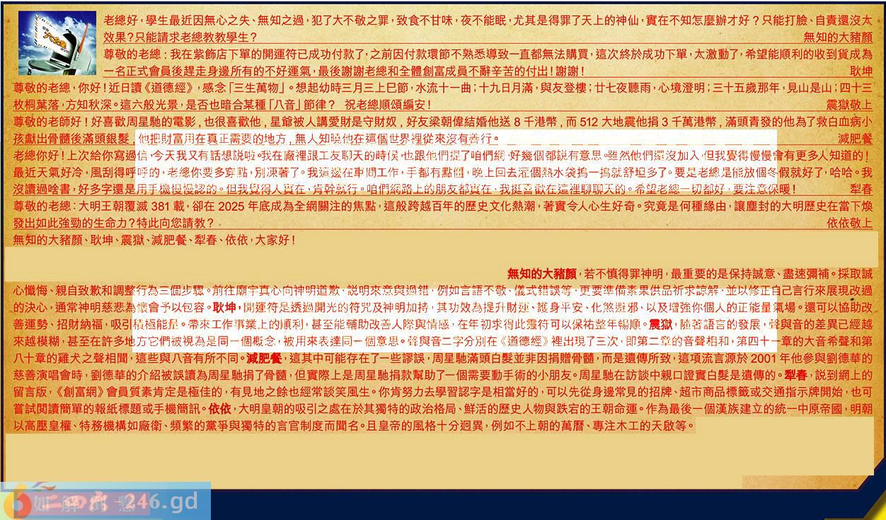 第023期《六合皇信箱文字版》10000%正確!!!正版二四六論壇*精心製作!!! 無知的大豬顏、耿坤、震獄、減肥餐、犁春、依依,大家好! 【1】.老總好,學生最近因無心之失、無知之過,犯了大不敬之罪,致食不甘味,夜不能眠,尤其是得罪了天上的神仙,實在不知怎麼辦才好?只能打臉、自責還沒太效果?只能請求老總教教學生?無知的大猪顔 〖無知的大猪顔〗:若不慎得罪神明,最重要的是保持誠意、盡速彌補。採取誠心懺悔、親自致歉和調整行為三個步驟。前往廟宇真心向神明道歉,説明來意與過錯,例如言語不敬、儀式錯誤等,更要準備素果供品祈求諒解,並以修正自己言行來展現改過的決心,通常神明慈悲為懷會予以包容。 【2】.尊敬的老總:我在紫飾店下單的開運符已成功付款了,之前因付款環節不熟悉導致一直都無法購買,這次終於成功下單,太激動了,希望能順利的收到貨成為一名正式會員後趕走身邊所有的不好運氣,最後谢謝老總和全體創富成員不辭辛苦的付出!謝謝!耿坤 〖耿坤〗:開運符是透過開光的符咒及神明加持,其功效為提升財運、護身平安、化煞避邪、以及增強你個人的正能量氣場。還可以協助改善運勢、招財納福,吸引積極能量。带來工作事業上的順利,甚至能輔助改善人際與情感,在年初求得此靈符可以保祐整年暢順。 【3】.尊敬的老總,你好!近日讀《道德經》,感念「三生萬物」。想起幼時三月三上已節,水流十一曲;十九日月滿,與友登樓;廿七夜聽雨,心境澄明;三十五歲那年,見山是山;四十三枚桐葉落,方知秋深。這六般光景,是否也暗合某種「八音」節律?祝老總順頌編安!震獄敬上 〖震獄〗:隨著語言的發展,聲與音的差異已經越來越模糊,甚至在許多地方它們被視為是同一個概念,被用來表達同一個意思。聲與音二字分別在《道德經》裡出現了三次,即第二章的音聲相和第四十一章的大音希聲和第八十章的難犬之聲相聞,這些與八音有所不同。 【4】.尊敬的老師好!好喜歡周星馳的電影,也很喜歡他,星爺被人講愛財是守財奴,好友梁朝偉結婚他送8千港幣,而512大地震他捐3千萬港幣,滿頭青發的他為了救白血病小孩獻出骨髓後滿頭銀髪,他把財富用在真正需要的地方,無人知曉他在這個世界裡從來沒有善行。減肥餐 〖減肥餐〗:這其中可能存在了一些謬誤,周星馳滿頭白髪並非因捐贈骨髓,而是遺傅所致,這項流言源於2001年他參與劉德華的慈善演唱會時,劉德華的介紹被誤讀為周星馳捐了骨髓,但實際上是周星馳捐款幫助了一個需要動手術的小朋友。周星馳在訪談中親口證實白髪是遺傳的。 【5】.老總你好!上次給你寫過信今天我又有話想説啦。我在廠裡跟工友聊天的時候,也跟他們提了咱們網,好幾個都説有意思。雖然他們還沒加入,但我覺得慢慢會有更多人知道的!最近天氣好冷,風刮得呼呼的,老總你要多穿點,別凍著了。我這邊在車間工作,手都有點僵,晚上回去灌個熱水袋搞一塢就舒坦多了。要是老總是能放個冬假就好了,哈哈。我沒讀過啥書,好多字還是用手機慢慢認的。但我覺得人實在、肯幹就行。咱們網路上的朋友都實在,我挺喜歡在這裡聊聊天的。希望老總一切都好,要注意保暖!犁春 〖犁春〗:説到網上的留言版,《創富網》會員質素肯定是極佳的,有見地之餘也經常談笑風生。你肯努力去學習認字是相當好的,可以先從身邊常見的招牌、超市商品標籤或交通指示牌開始,也可嘗試閲讀簡單的報紙標題或手機簡訊。 【6】.尊敬的老總:大明王朝覆滅381載,卻在2025年底成為全網關注的焦點,這般跨越百年的歷史文化熱潮,著實令人心生好奇。究竟是何種緣由,讓麈封的大明歷史在當下焕發出如此強勁的生命力?特此向您請教?依依敬上 〖依依〗:大明皇朝的吸引之處在於其獨特的政治格局、鮮活的歷史人物與跌宕的王朝命運。作為最後一個漢族建立的統一中原帝國,明朝以高麼皇權、特務機構如廠衛、頻繁的黨爭與獨特的言官制度而聞名。且皇帝的風格十分迴異,例如不上朝的萬暦、專注木工的天啟等。 紅字:如解倒懸 暗码:01212629 [释义]比喻把人从危难中解救出来。 [出处]《孟子·公孙丑上》:“当今之时,万乘之国行仁政,民之悦之,犹解倒悬也。”