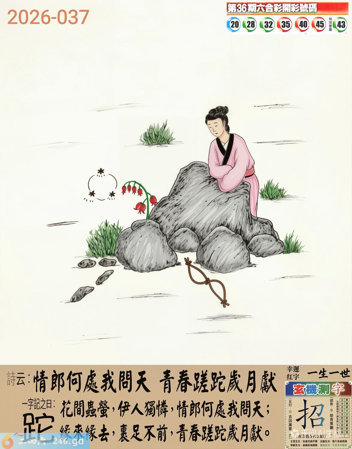 2026年4月7日二月二十星期二钗钏金猪日冲蛇 037期:老版跑狗玄機一字記之曰:【跎】 詩云:情郎何處我問天,青春蹉跎歲月獻 花間蟲螢,伊人獨憐,情郎何處我問天; 緣來緣去,裹足不前,青春蹉跎歲月獻。 玄機測字:《招》 密圖詩:有七有八出紅波 記:來回三局敗一地 特碼大小單雙句:非驢非馬 今期必中:趙雲 037期:特碼歇后語 嫩苗苗-----根底浅 037期正版四字梅花诗:小肚鸡肠。 037期火车头:烧伤狗。诗:牛死龙伤,一三并取开头奖。 037期香港第一手欲钱料:起床。 037期曾道人说:“女人?” 037期另版四字梅花诗:春天来临。 037期香港第一手欲钱料:欲钱找跑得快最蠢的动物。 037期曾道人说:“为什么过四十三的男人喜欢赌博”? 037期:二字经:蓝红。 037期:扫把是特码 037期:智力金壤:天罗地网 037期信箱紅字:【家傳戸曉】 037期暗码:【13171946】 037期一語中特:【三姑六婆】 發財玄機圖:形影不離探索態望圖中明猴紅藍 037期:藏寶圖 新:只今犹有疏野调 老:青门瓜地新冻裂 禁:蛇禁:8尾玄机字《逦》 2026年037期【生活幽默】版 〖穩定的工作〗 一青年做事總是毛手毛脚,所以老是失業。 這一次,他又找到一份工作,是替一家古董店幹活。 才上班的第一天,他就不小必把店裹的一衹較昂貴的玻璃瓶給摔碎了。 老板很生氣:"這衹瓶子的價錢我會在你每個月的工资内扣。" 這青年一聽,鬆了口氣説:"謝天謝地,我终于找到了一份穩定的工作。"